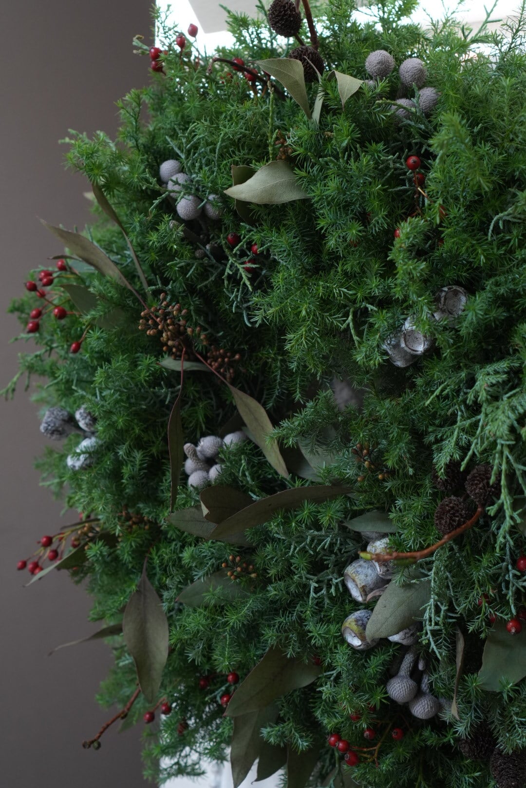 この時期ならではの、針葉樹を使った香り高いクリスマスリースです。